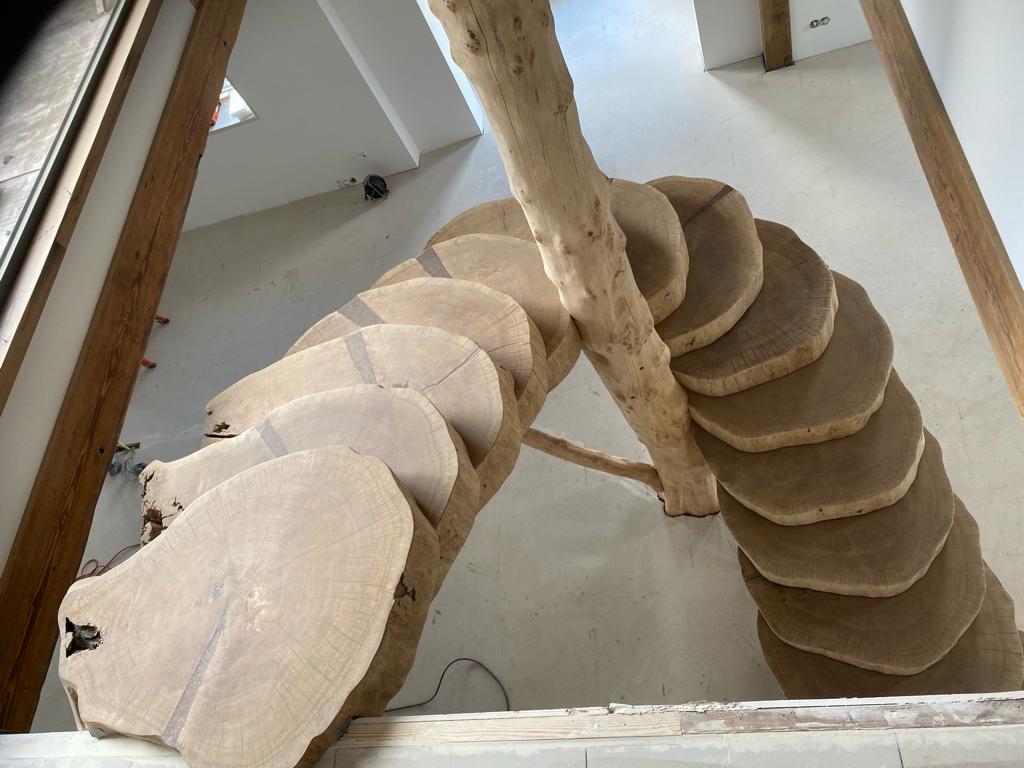 Onze trappen worden vervaardigd uit schijven van imposante Nederlandse boomstammen, met een passie voor precisie. Met behulp van onze unieke zaag, die boomstammen tot wel 2500 cm breed aankan, behouden we de authentieke schoonheid en rijke geschiedenis van elke boom. Of het nu gaat om een imposante trap voor een statig entree of een charmante trap als middelpunt van uw woning, wij maken het mogelijk.
